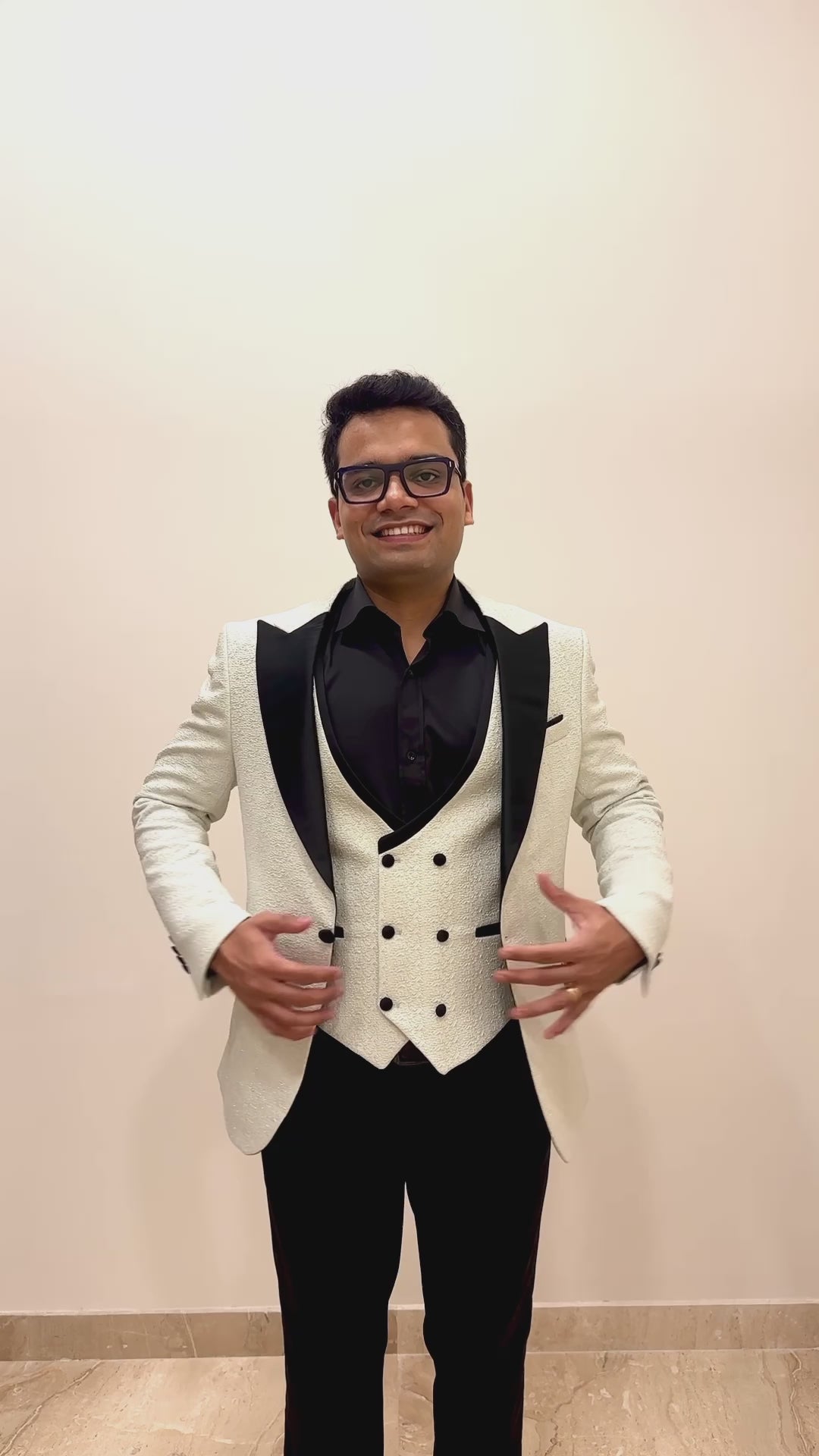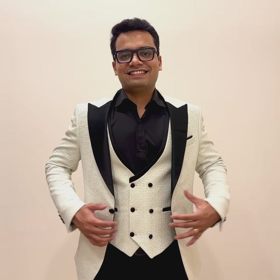 The Ivory Royale is designed for the groom or wedding guest who wants to stand out without overpowering the occasion. Crafted in Europe, its luxurious ivory fabric features a subtle embossed texture, creating depth and sophistication without glitter or excess. The bold black satin shawl lapel adds sharp contrast, complemented by the matching waistcoat for a refined silhouette. Lightweight tailoring ensures comfort through long ceremonies, receptions, and evening celebrations. This suit is the perfect balance of classic charm and modern statement style.