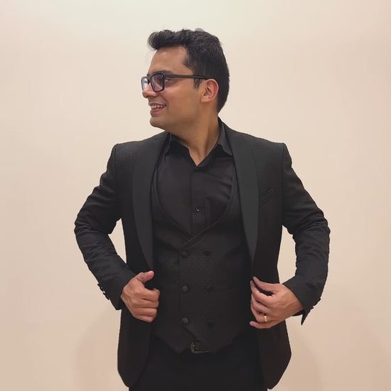Step into timeless sophistication with the Onyx Regent, a European-crafted black textured 3-piece tuxedo suit that redefines modern elegance. Designed for men who value understated luxury, it features a subtle diamond-patterned fabric that adds depth without overpowering the look. The sleek black satin shawl lapel offers a refined finish, making it perfect for weddings, receptions, and high-profile events.